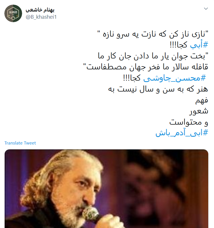 پس از انتشار این پست، مهشید برومند، همسر ابراهیم حامدی، خواننده ایرانی خارجنشین که با نام هنری «ابی» به فعالیت در این عرصه میپردازد، در اینستاگرام خود به بیت درج شده در پست چاووشی اهانت کرد و او را عربپرست خواند. او با گرفتن ژست میهنپرستی، به برخی اتفاقات اخیر همچون سقوط هواپیمای اوکراینی اشاره کرد و در انتهای متن طولانی خود اینطور به محسن چاووشی حمله کرد: