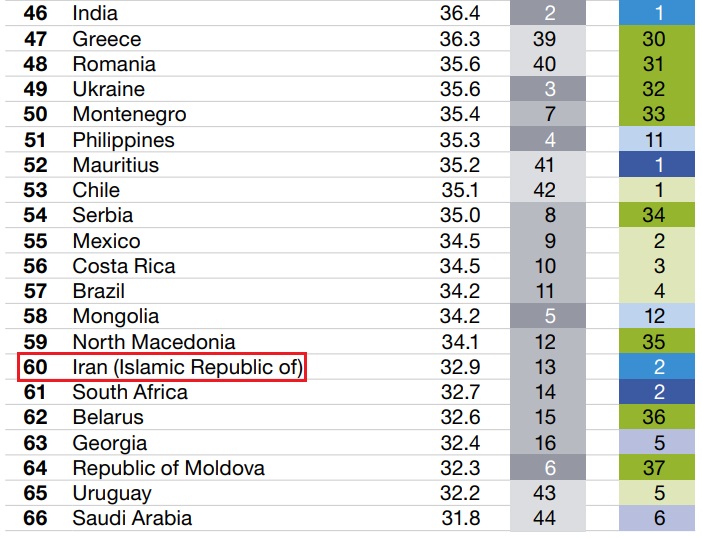 ایران که در سال ۲۰۲۰ با تنزل چند پله‌ای در جایگاه ۶۷ جهان قرار گرفته بود، در سال ۲۰۲۱ با ۷ پله صعود و کسب جایگاه ۶۰ جهان، به عنوان یکی از کشور‌هایی است که بیشترین ارتقای رتبه را داشته است. درگزارش اخیر، رده‌بندی کشور‌ها به تفکیک منطقه و سطح درآمدی نیز ارائه شده و ایران در میان کشور‌های دارای درآمد متوسط به بالا در جایگاه ۱۳ و در میان کشور‌های منطقه آسیای مرکزی و جنوبی، پس از هند، در جایگاه دوم قرار گرفته است.