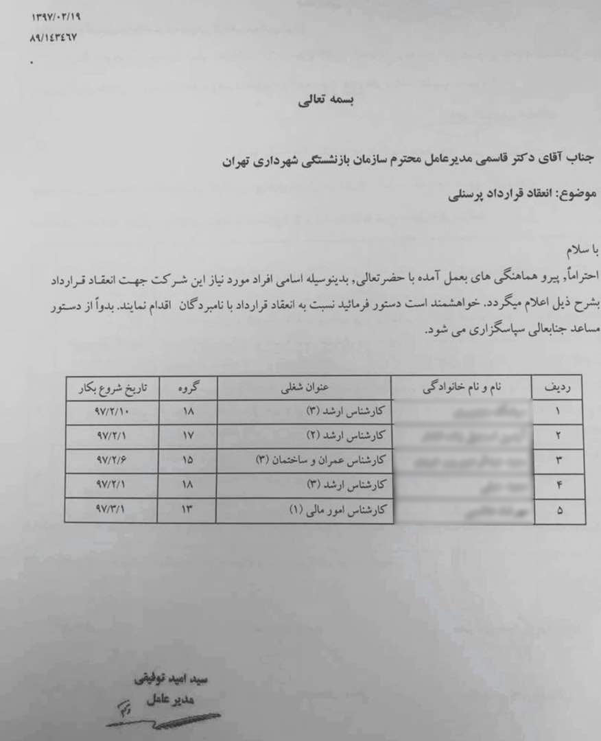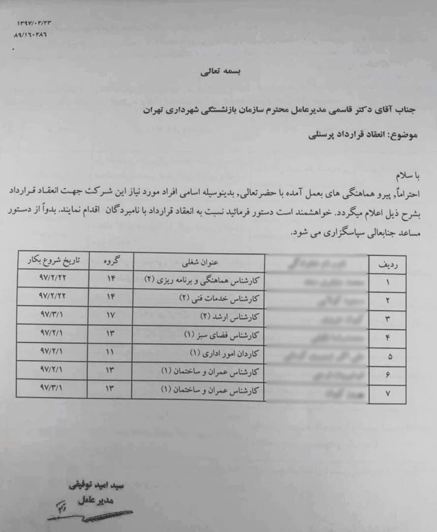با این همه سید امید توفیقی مدیرعامل شرکت عمران کارکنان شهرداری تهران در نامهای به قاسمی مدیرعامل سازمان بازنشستگی درخواست جذب ۱۲ نیروی جدید داشته است. مضمون نامه نشان میدهد پیش از این با استخدامها موافقت شده است؛ چه آنکه اطلاعات نامه حاکی از آن است که تاریخ شروع و همچنین رتبه نیز برای نیروها مشخص شده است.