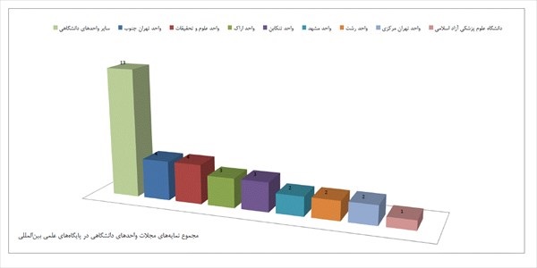 واحدهای علوم و تحقیقات با ۳۸ مجله علمی، واحد تهران مرکزی با ۲۳ مجله علمی و واحدتهران جنوب با ۱۴ مجله علمی بهترتیب بیشترین انتشارات علمی را به خود اختصاص دادهاند که در این بین سهم مجلات بانمایههایISI و ISC در واحد تهران جنوب و واحد علوم و تحقیقات دانشگاه آزاد اسلامی بیشتر از سایر واحدها است.