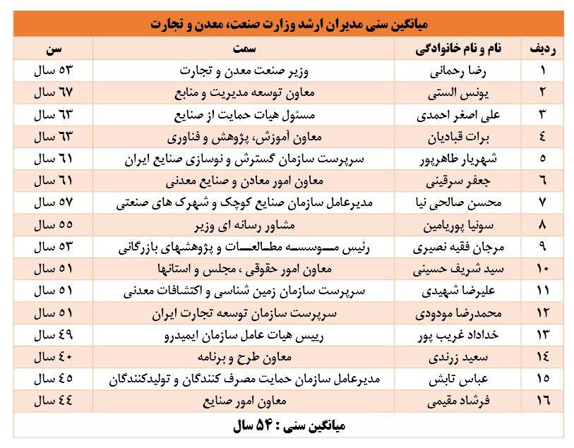 وزارت صنعت، معدن و تجارت نیز یکی از وزارتخانه های پیر است. در حال حاضر میانگین سنی مدیران این وزارتخانه 54 سال است و رضا رحمانی که در جلسه رای اعتمادش وعده جوانگرایی داده بوده، وعده خودش را فراموش کرده است. جالب اینجاست بدانیم که میانگین سنی وزارتخانه صمت در زمان حضور رضا رحمانی نسبت به وزیر قبل بدتر شده است.