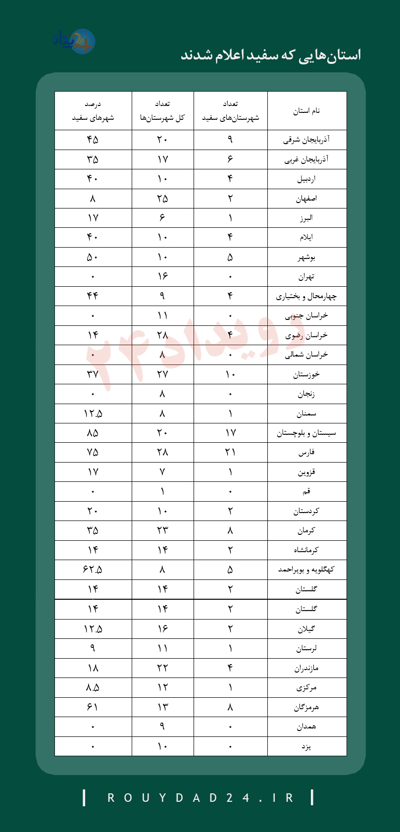 براساس فهرست اعلام شده تعداد شهرهای با وضعیت سفید در برخی استانهای کشور بسیار بالا بودند که به طور مشخص استانهای سیستان و بلوچستان، کهگلویه و بویراحمد، هرمزگان و فارس، بیشترین تعداد شهرهای سفید را به خود اختصاص دادهاند.