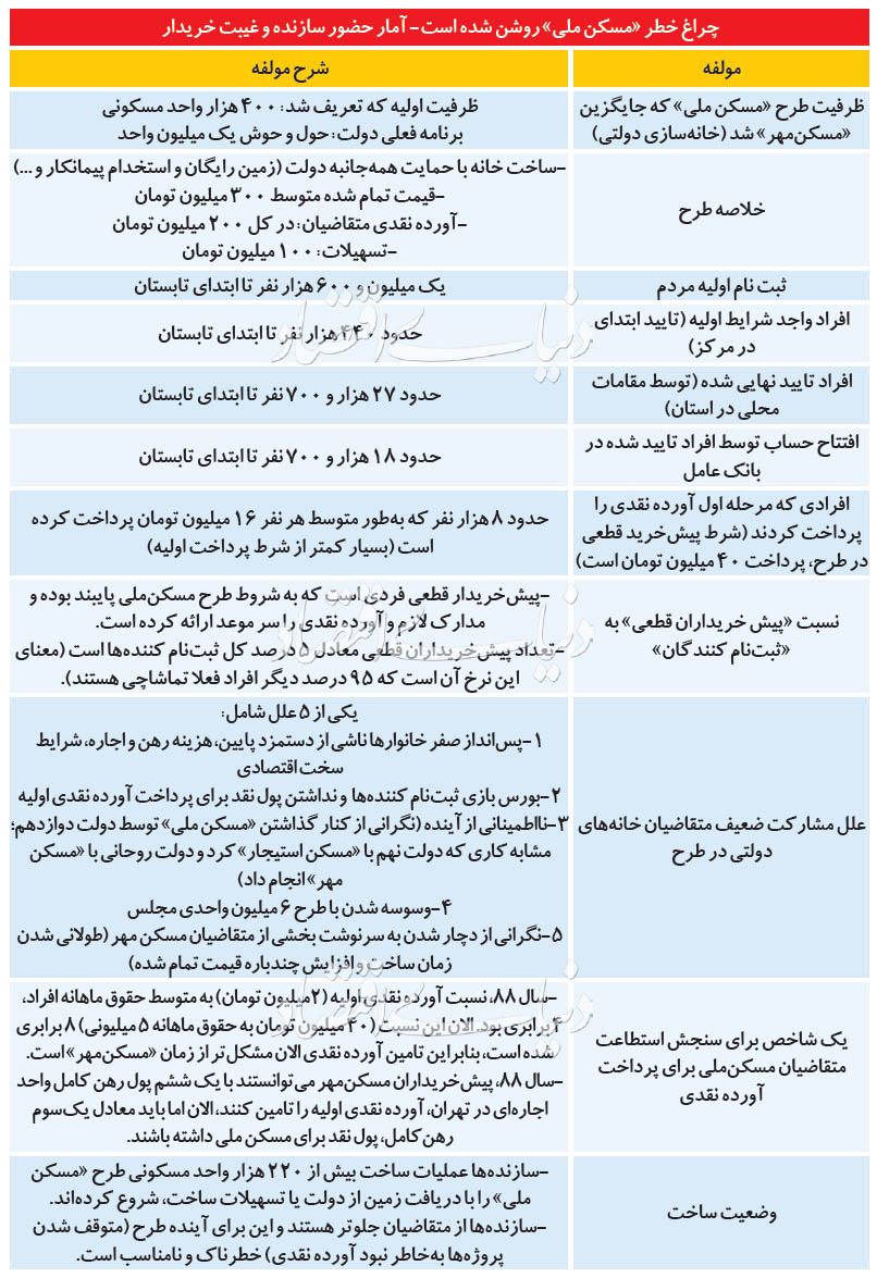 شعار سال : حداقل ۴۰۰ هزار خانوار فاقد مسکن از ۶/ ۱ میلیون ثبتنامکننده در این طرح، واجد شرایط خانههای دولتیساز هستند. از این تعداد -تا اوایل تابستان- فقط ۸ هزار نفر «بخش اول آورده نقدی» را واریز کردهاند که البته پرداختی آنها کمتر از نصف مبلغ ابلاغی بوده است. پرهیز یا ناتوانی متقاضیان از پرداخت بهای این آپارتمانها بیانگر نبود «خریدارموثر» است و ۵ علت دارد.