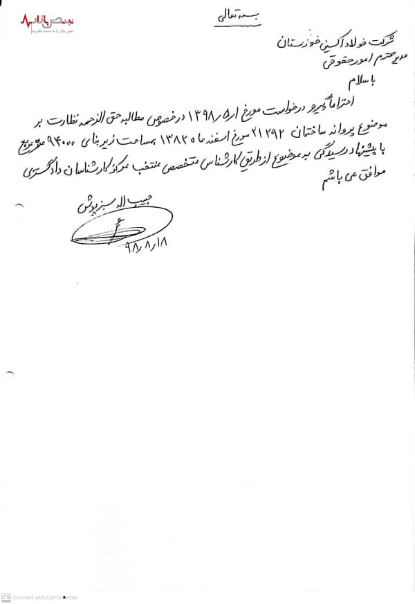 به همین دلیل و پرداخت حق ماموریت ایشان از طرف فولاد خوزستان شرکت فولاد اکسین هیچگونه قراردادی در این خصوص با وی منعقد نکرده است. ذکر این نکته نیز بسیار مهم است که ناظر شرکت مذکور، شرکت مهندسی فن آور معادن و فلزات (MMTE) و شرکت ایتالیایی دانیلی بوده است.