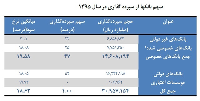 موضوع ديگر اما حضور فعال بانك مركزي در اين بازار است. گزارش ها نشان می دهد که بانك مركزي سال گذشته 17 هزار و 920 ميليارد تومان سپردهپذيري داشته است. بر اساس اعلام بانک مرکزی نرخ سود بانکهای خصوصی در سال 1395 در بازار بین بانکی 19.58 درصد و نرخ سود بانکهای دولتی 18.05 درصد بوده است.